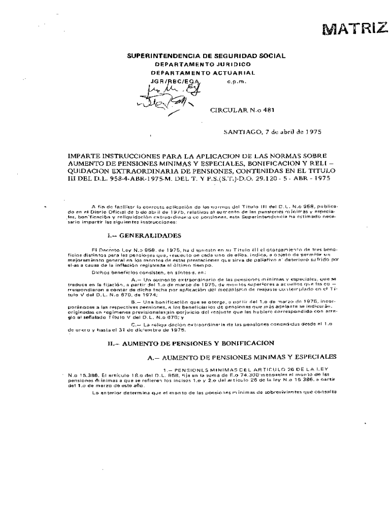 MIA TRI SUPERINTENDENCE DE SCIURIDAE SOCIAL DEPARTMENT JURIDIC ACTUARIAL c.p.m.CIRCULAR N.o 481 SANTIAGO, 7 de April de I975IMPARTE INSTRUCTIONS PARA LA APPLICATION DE LAS NORMAL SORE AUGMENT DE PENSIONS