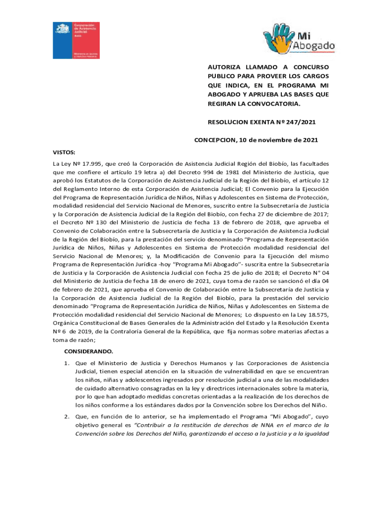 AUTHORIZE LLAMA DO A CONCURS PUBLIC PARA PROV EER LOS CARGOS QUE INDIA, EN EL PROGRAM AMI AVOCADO Y ARUBA LAS BASES QUE REGION LA CONVOCATORIA. RESOLUTION EVENT N 247/2021 CONCEPCION, 10 de November