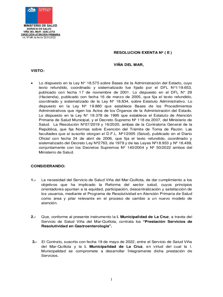 MINISTER DE SALAD SERVICE DE SALAD VIA DEL MAR QUOTA DIRECTION STENCIL PRIM ARIA Int. N546 de tech 29.05.2022RESOLUCION EVENT N (E)VIA DEL MAR, VITO: Lo dispute en la La N 18.575 sober Bases de la