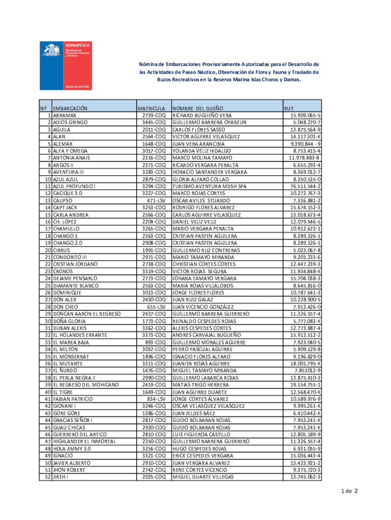 Nina de Embarcaciones Provisoriamente Autorizadas para el Desarrollo de leis Activities de Pasco Notice, Observation de Flora y Fauna y Translator de Buzos Recreation en la Reserve Marina Islam Chorus