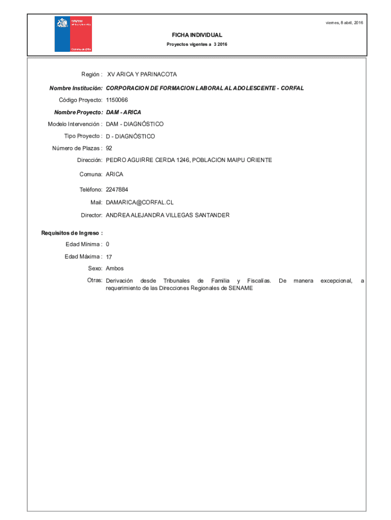Earned, 8 April, 2016FICHA INDIVIDUAL Projects Vicente a 3 2016Regin : XV ARICA Y PARINACOTA Hombre Institution: CORPORACIÓN DE FORMATION LABOR AL ADOLESCENT CORFALCdigo Project: 1150066 Hombre Project:
