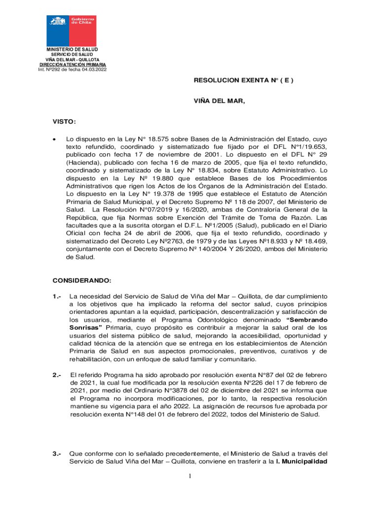 MINISTER DE SALUDSERVICIO DE SALAD VIA DEL MAR QUOTA DIRECTION STENCIL PRIM ARIA Int. N292 de tech 04.03.2022RESOLUCION EVENT N (E)VIA DEL MAR, VITO: Lo dispute en la La N 18.575 sober Bases de la