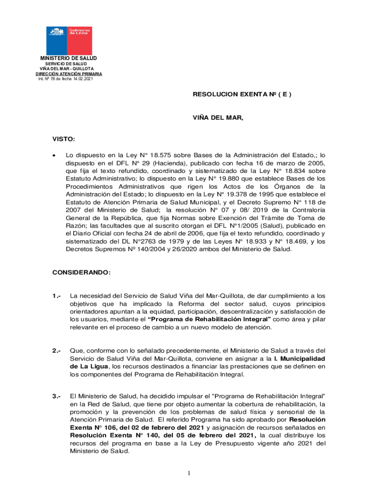 MINISTER DE SALAD SERVICE DE SALAD VIA DEL MAR QUOTA DIRECTION STENCIL PRIM ARIA Int. N 78 DE tech 14.02.2021RESOLUCION EVENT N (E)VIA DEL MAR, VITO: Lo dispute en la La N 18.575 sober Bases de la