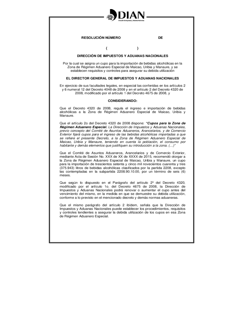 RESOLUTION NERO(DE)DIRECTION DE IMPETUS Y AQUINAS NATIONALS POR la coal SE sign UN cup para la importation DE besides alcoholics en la Zone de Rgimen Adultery Especial de Macao, Arabia y Manure, y