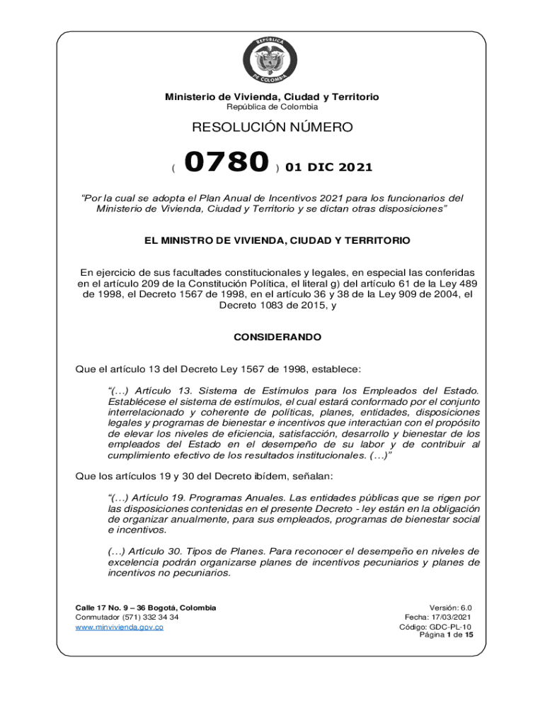 Minister de Vivienda, Ciudad y Territory Replica de ColombiaRESOLUCIN NERO (0780) 01 DIC 2021Por la coal SE adopt El Plan Annual de Incentivos 2021 para Los functionaries Del Minister de Vivienda,