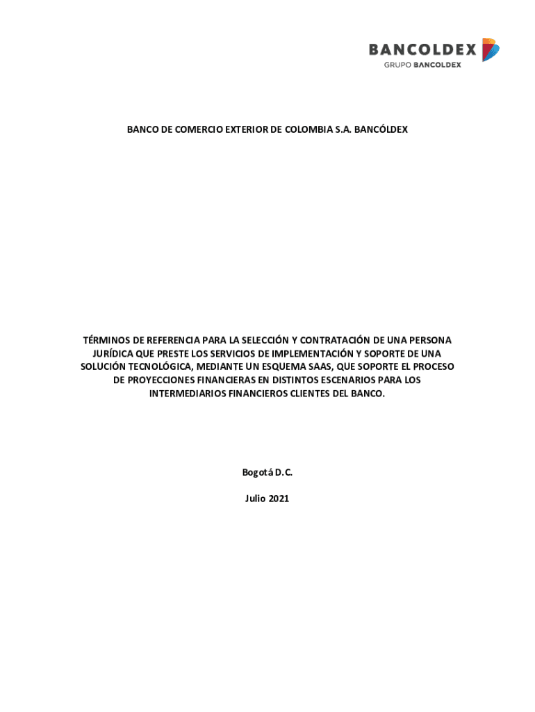 BANCO DE COMER CIO EXTERIOR DE COLOMBIA S.A. BANCLDEXTRMINOS DE REFERENCE PARA LA SELECTION Y CONTRATACIN DE RNA PERSONA JURIDICAL QUE PRESTO LOS SERVICES DE IMPLEMENTATION Y SPORTS DE RNA SOLUTION