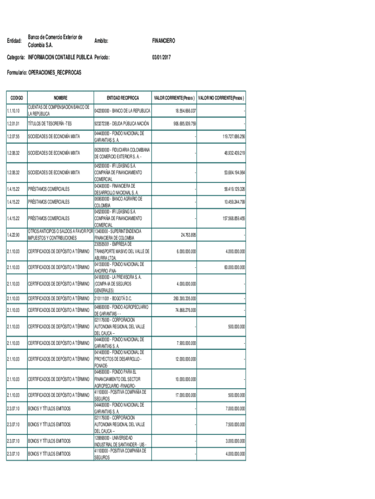 03/01/2017Formulario: OPERATIONS_RECIPROCASCODIGONOMBREENTIDAD RECIPROCAVALOR CORRINE(Pesos)VALOR