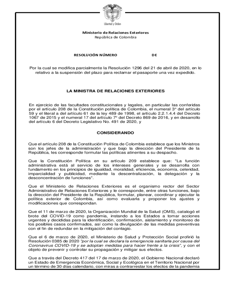 Minister de Relaciones Exteriors Replica de ColombiaRESOLUCIN NMERODEPor la coal SE modified Parliament la Resolution 1296 Del 21 de April de 2020, en lo relative à la suspension Del plaza para reclaimer