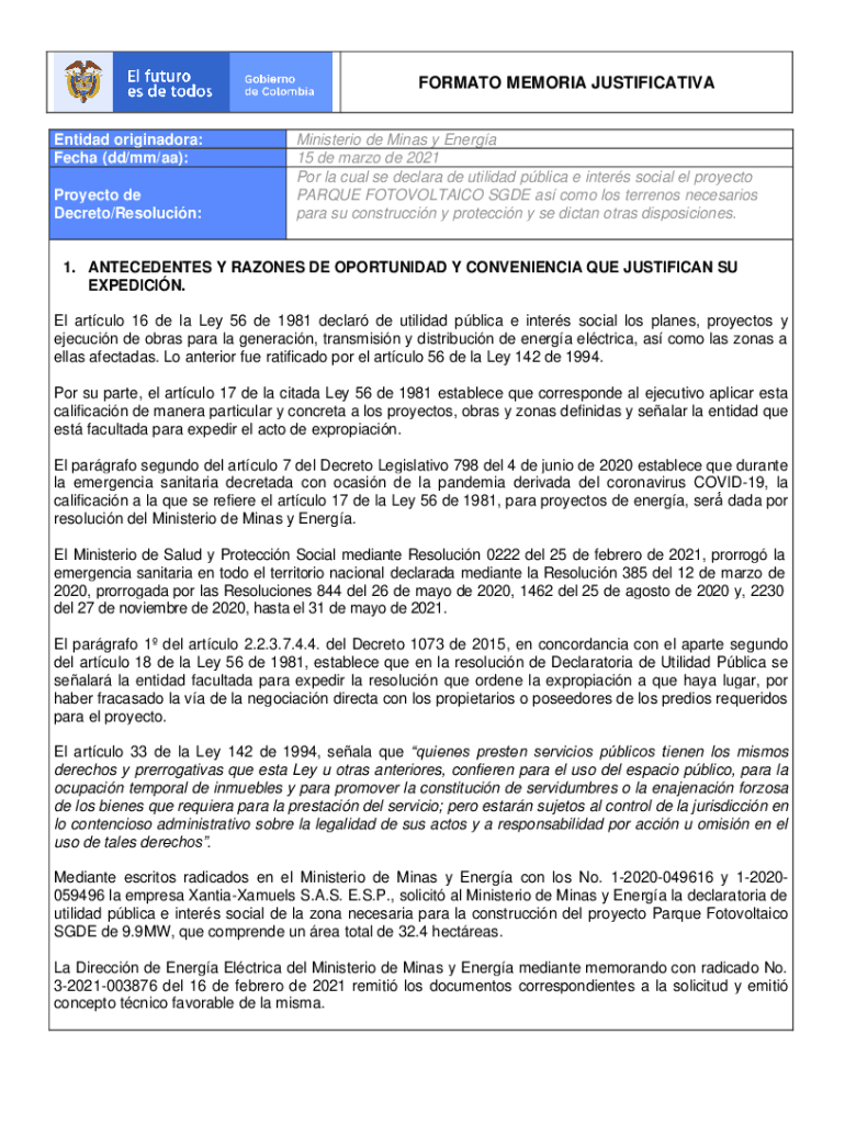 FORMAT MEMORIAL JUSTIFICATION Enticed originator: Tech (dd/mm/AA): Project de Decreto/Resolution:Minister de Mines y Energy 15 de Mario de 2021 POR la coal SE declare DE utilized public e inters social