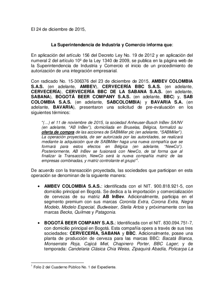 El 24 de December de 2015,La Superintendence de Industria y Coercion inform Que: