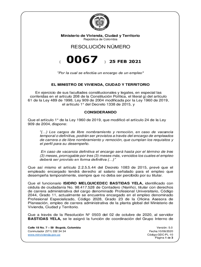Minister de Vivienda, Ciudad y Territory Replica de ColombiaRESOLUCIN NERO (0067) 25 FEB 2021Por la coal SE effect un encargo de UN temple\” EL MINISTRY DE VIVIENNE, CIUDAD Y TERRITORY En Jericho