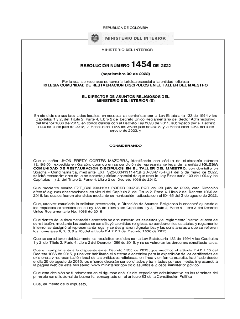 REPUBLICAN DE COLOMBIAMINISTERIO DEL INTERIORRESOLUCIN NMERO1454 DE 2022(September 09 DE 2022)