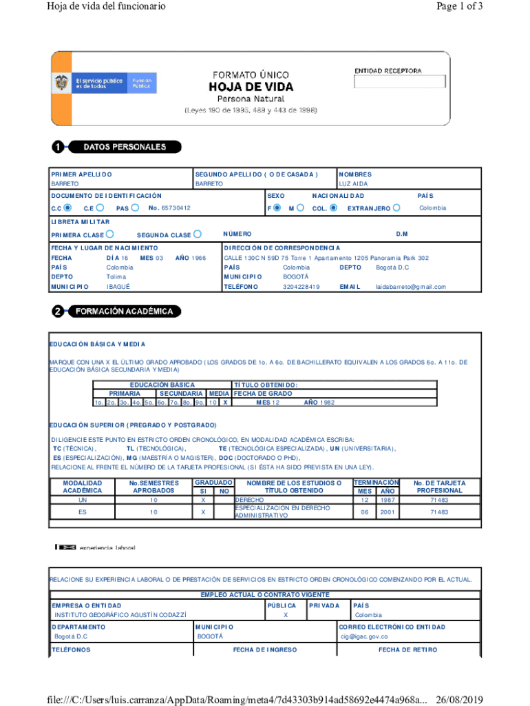 Hora de Vida Del funcionarioPage 1 of 3PRIMER APELLIDOSEGUNDO ADELAIDE (O DE CANADA)NOMBRESBARRETOBARRETOLUZ AIDADOCUMENTO DE IDENTIFICATION C.CC. Second. 65730412PASNACIONALIDAD MF COL.PAS ColombiaEXTRANJEROLIBRETA