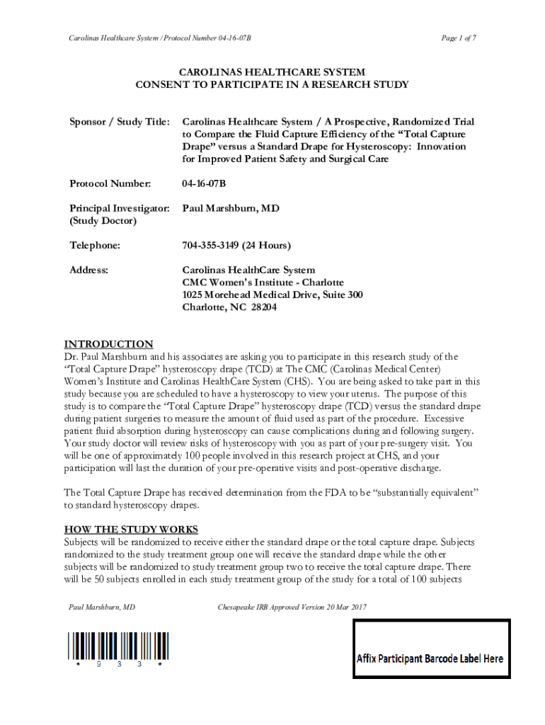 Carolina's Healthcare System / Protocol Number 041607BPage 1 of 7CAROLINAS HEALTHCARE SYSTEM CONSENT TO PARTICIPATE IN A RESEARCH STUDY Sponsor / Study Title:Carolina's Healthcare System / A Prospective,