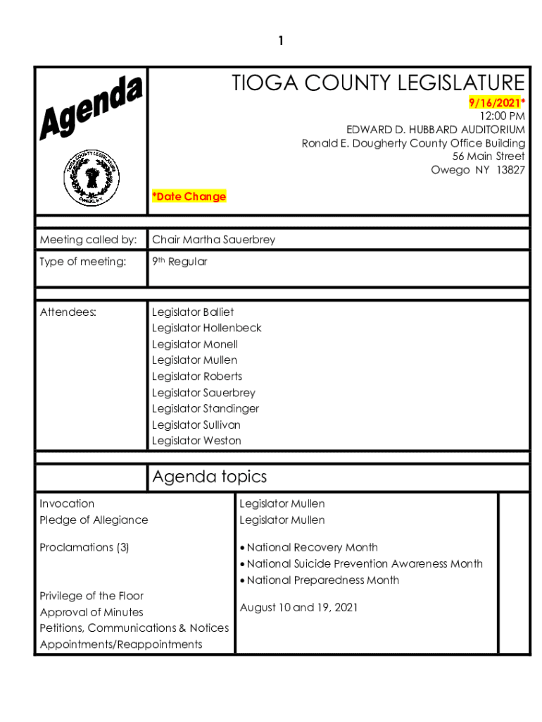 1TIOGA COUNTY LEGISLATURE 9/16/2021× 12:00 PM EDWARD D. HUBBARD AUDITORIUM Ronald E. Dougherty County Office Building 56 Main Street Ow ego NY 13827 *Date ChangeMeeting called by:Chair Martha SauerbreyType