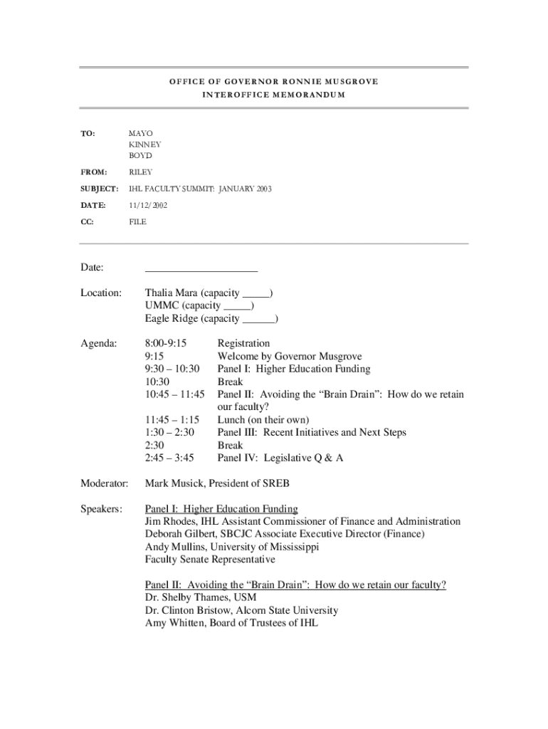 OFFICE OF GOVERNOR RONNIE MUSGROVE INTEROFFICE MEMORANDUM TO:MAYO KINNEY BOYDFROM:RILEYSUBJECT:ILL FACULTY SUMMIT: JANUARY 2003DATE:11/12/2002CC:FILED ate:___Location:Thalia Mara (capacity ___) USMC