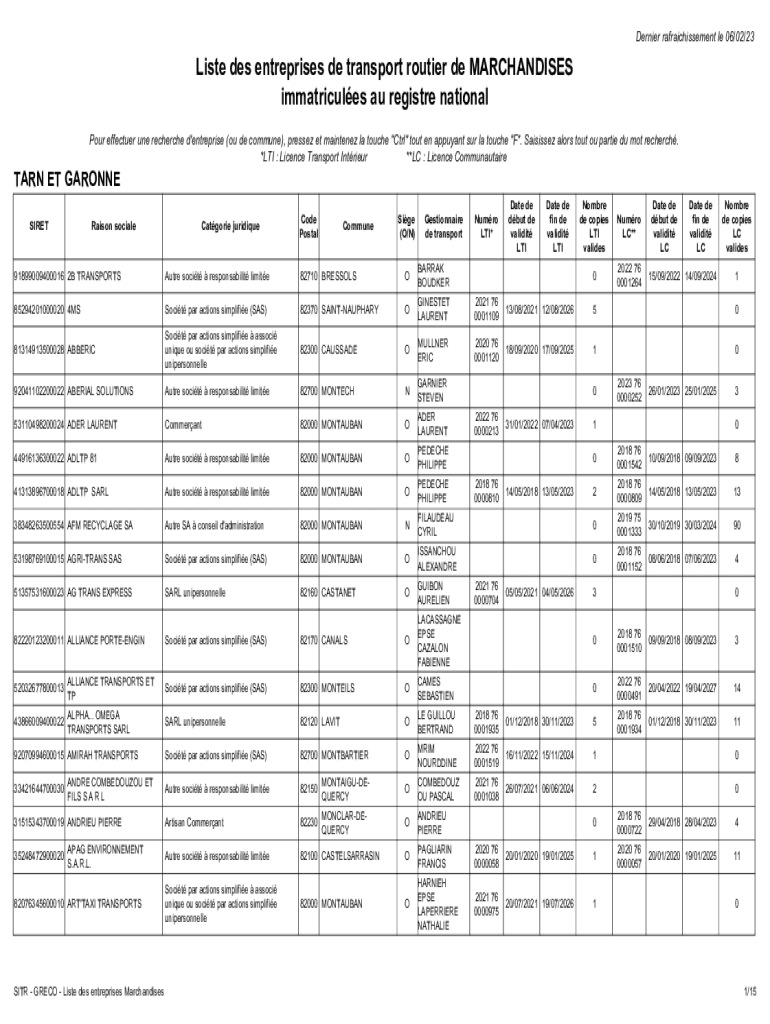 Denier rafraichissement LE 06/02/23Liste DES enterprises DE transport router DE MERCHANDISES