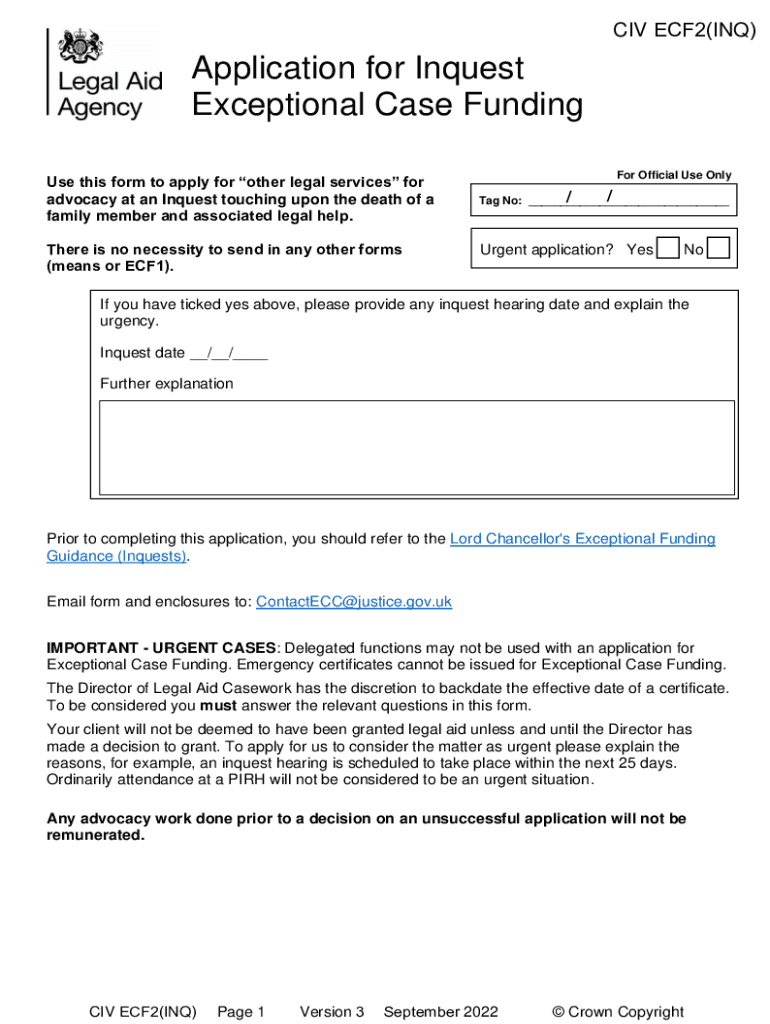CIV ECF2(IN)Application for Inquest Exceptional Case Funding For Official Use Only this form to apply for other legal services for advocacy at an Inquest touching upon the death of a family member