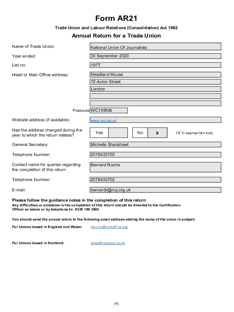 Name of Trade Union:National Union Of JournalistsYear ended:30 September 2020List no:197THead or Main