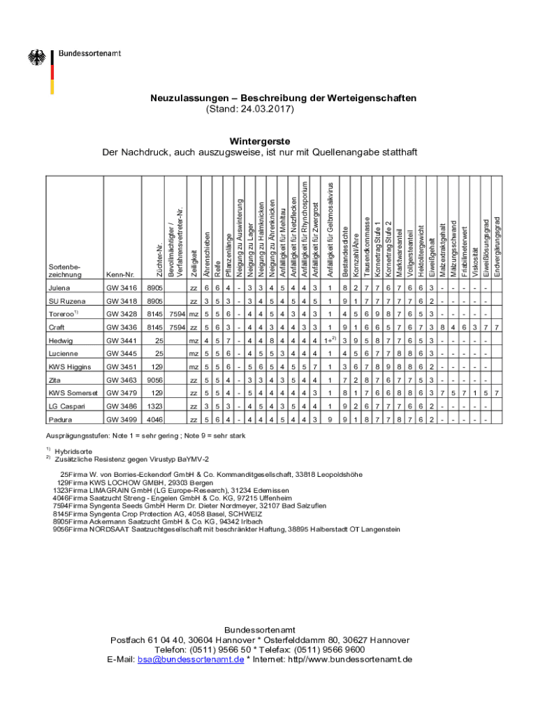 (Stand: 24.03.2017)Anflligkeit for GelbmosaikvirusBestandesdichte