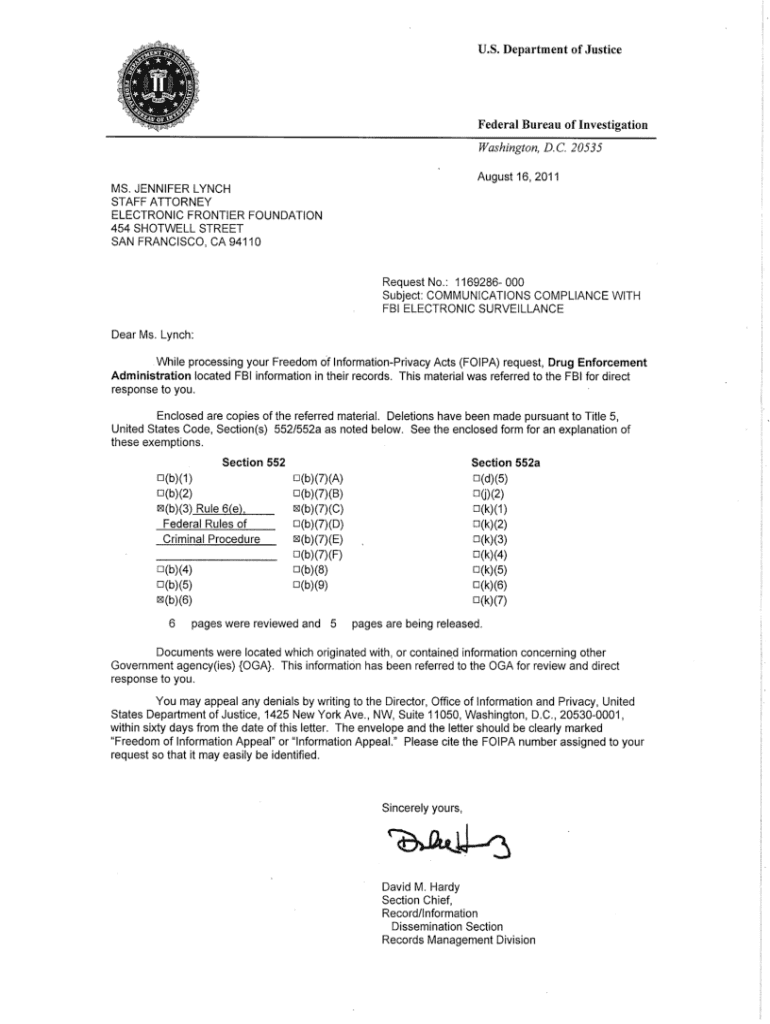 U.S. Department of Justice Federal Bureau of Investigation Washington, D.C. 20535 August 16, 2011, MS. JENNIFER LYNCH STAFF ATTORNEY ELECTRONIC FRONTIER FOUNDATION 454 HOWELL STREET SAN FRANCISCO,