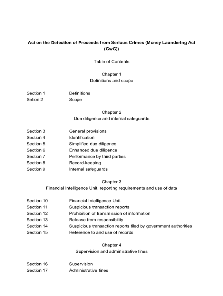 Act on the Detection of Proceeds from Serious Crimes (Money Laundering Act (GWG)) Table of Contents Chapter 1 Definitions and scope Section 1 Section 2Definitions Scope Chapter 2 Due diligence and