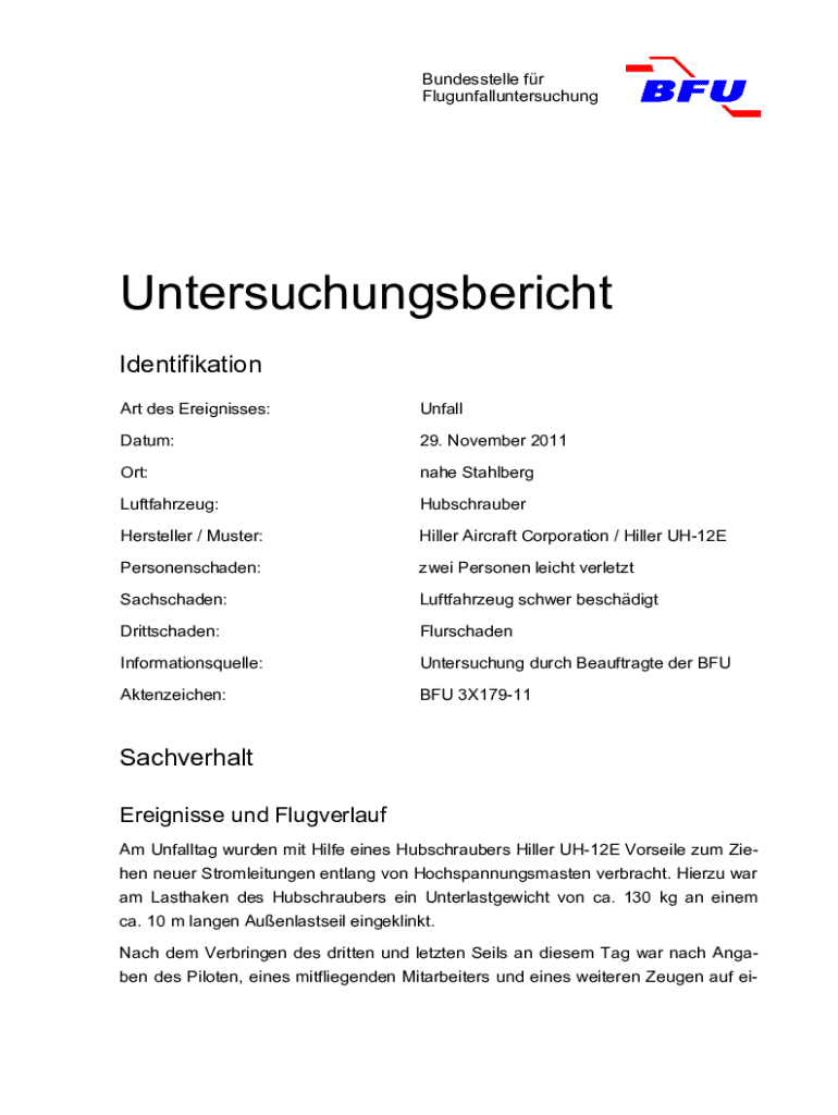 Bundesstelle for FlugunfalluntersuchungUntersuchungsbericht Identification Art DES Reignites:UnfallDatum:29. November 2011Ort:name StahlbergLuftfahrzeug:HubschrauberHersteller / Muster:Hitler Aircraft