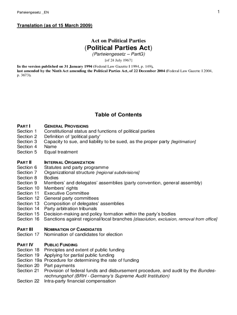 1Parteiengesetz _Translation (as of 15 March 2009)Act on Political Parties(Political Parties Act) (Parteiengesetz Part) [of 24 July 1967] In the version published on 31 January 1994 (Federal Law Gazette