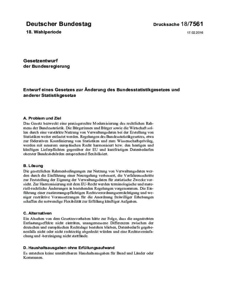 Deutsche BundestagDrucksache 18/756118. WahlperiodeGesetzentwurfder BundesregierungEntwurf lines Reserves our during DES Bundesstatistikgesetzes UND