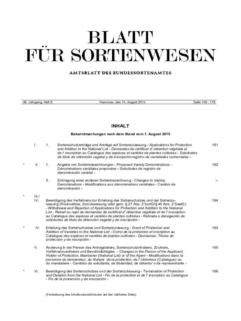 Bekanntmachungen each them Stand com 1. August 2015×I.1. Sortenschutzantrge UND Antigen AUF Sortenzulassung Applications for Protection