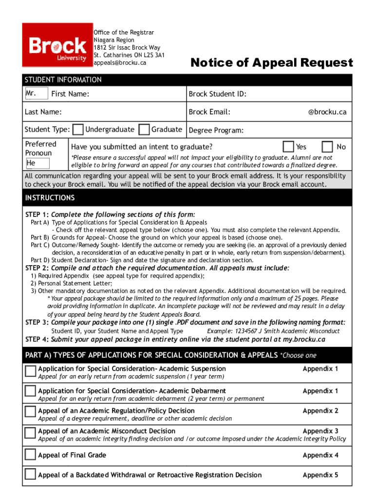 Office of the Registrar Niagara Region 1812 Sir Issac Brock Way St. Catharines ON L2S 3A1 appeals@brocku.caNotice of Appeal RequestSTUDENT INFORMATION Mr. First Name: MX. Ms. Last Name: UndergraduateStudent