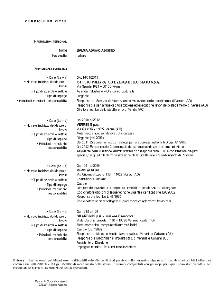 CURRICULUM VITAEINFORMAZIONI PERSONAL Nome NazionalitBALMA ADRIANO AGOSTINHO ItalianaESPERIENZA ELABORATIVE Date (the a) Nome e indirizzo Del date DI favor Tip DI agenda o set tore Tip DI impair Principal