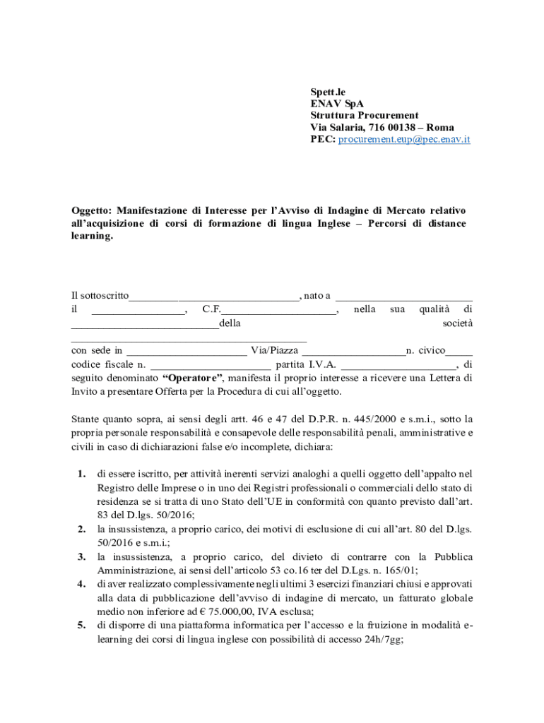 Spent.LE EAV Spa Structure Procurement Via Malaria, 716 00138 Roma PEC: procurement.eup@pec.enav.itOggetto: Manifestation DI Interest per lavish DI Imagine DI Mercado relative allacquisizione DI corgi