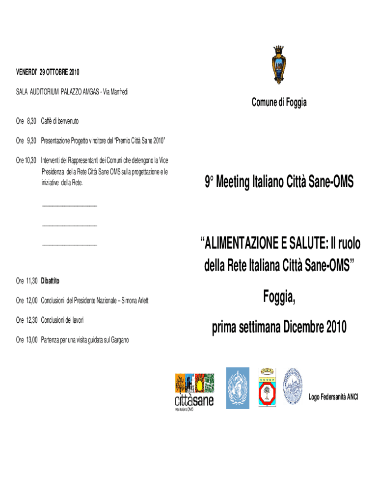 Ore 8,30Caff DI benvenutoOre 9,30Presentazione Project victory Del Premix City Sane 2010Ore 10,30Interventi DEI Rappresentanti