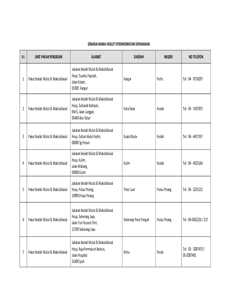 BIL UNIT DAKAR PERGIGIANALAMATDAERAHNEGERINO TELEFONPakar Bed ah Mulct & MaksilofasialJabatan Bed ah Mulct & Maksilofasial