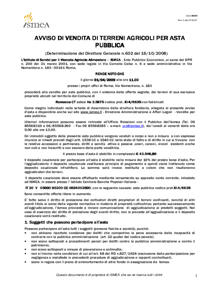 SG M246 Rev: 0 Del 07/03/07AVVISO DI VEND ITA DI TERR ENI AGRICOLA PER ASIA PUBLIC (Determination Del Director General n.602 Del 16/10/2008) Institute di Service per IL Mercado Agricola Alimentary