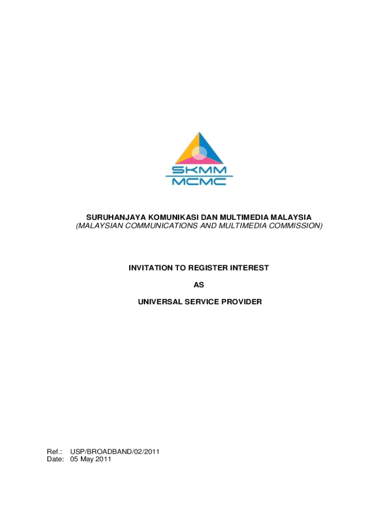 SURUHANJAYA KOMUNIKASI DAN MULTIMEDIA MALAYSIA (MALAYSIAN COMMUNICATIONS AND MULTIMEDIA COMMISSION)INVITATION TO REGISTER INTEREST AS UNIVERSAL SERVICE Provider.: USP/BROADBAND/02/2011 Date: 05 May
