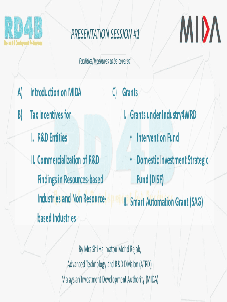 PRESENTATION SESSION #1 Facilities/Incentives to be covered:A)Introduction on MIDAS)Tax Incentives for) Grants I. Grants under Industry4WRDI. R&D Entities Intervention Funding. Commercialization of