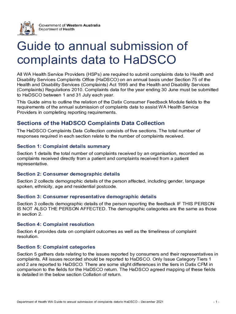 Get the free Guide to annual submission of complaints data to HaDSCO