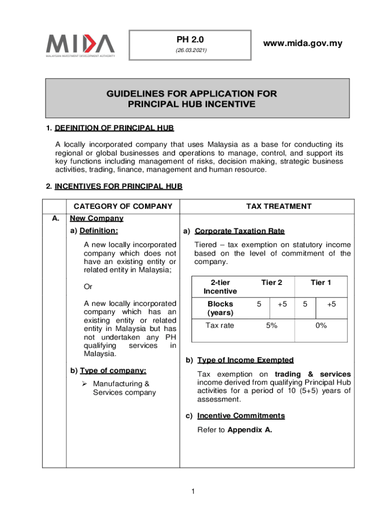 PH 2.0www.mid.gov.my(26.03.2021)1. DEFINITION OF PRINCIPAL HUB A locally incorporated company that uses Malaysia as a base for conducting its regional or global businesses and operations to manage,