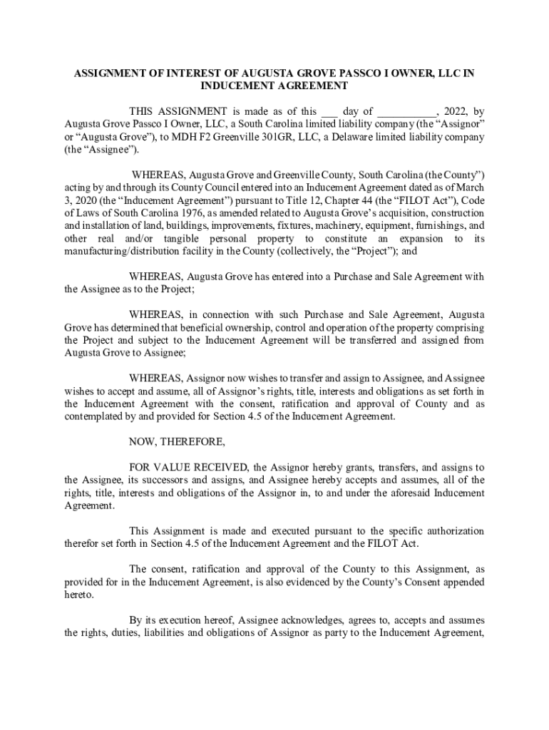 ASSIGNMENT OF INTEREST OF AUGUSTA GROVE PASCO I OWNER, LLC IN INDUCEMENT AGREEMENT THIS ASSIGNMENT is made as of this ___ day of ___, 2022, by Augusta Grove Pasco I Owner, LLC, a South Carolina limited