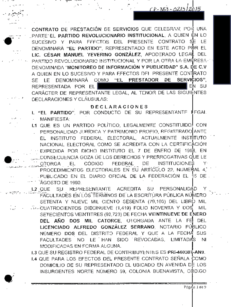 TT z, .....:.!.,,, c:, \”, I IC. P 353 AJJ.l.3 2lJJ5 I. R.JP: JJJJ5DVb/1ttJt./9ICONTRATO DE PR ESTAC:ON DE SERVICES QUE Celebrate\'1\', PO RNA .PARE EL PARTIES REVOLUTIONARY INSTITUTIONAL, A QUEEN