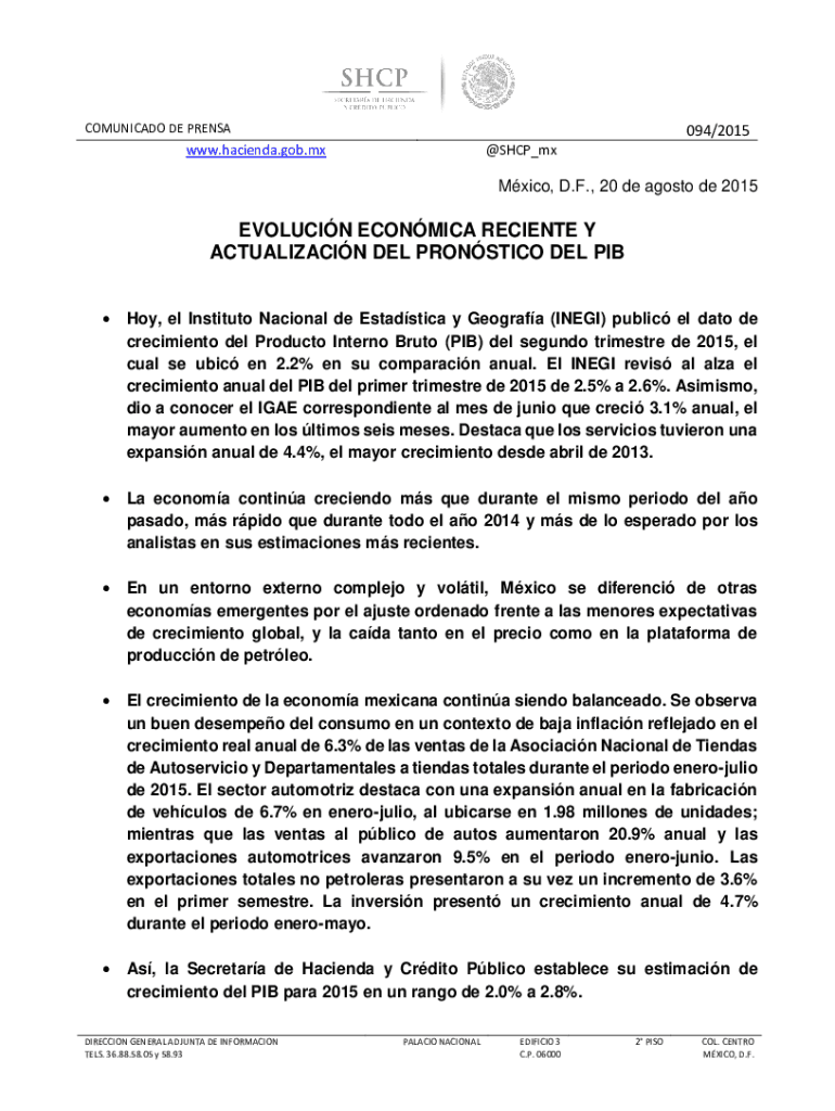 COMMUNICATE DE PRENSA094/2015www.hacienda.gob.mishap_Mexico, D.F., 20 de Acosta de 2015EVOLUCIN ECONOMIC RECENT Y