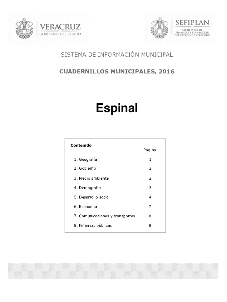 SYSTEM DE INFORMATION MUNICIPAL CUADERNILLOS MUNICIPALS, 2016Espinal Contend Gina 1. Geografa12. Gobierno23. Media ambiente24. Demografa35. Desarrollo social46. Economa77. Communications y transportes88.