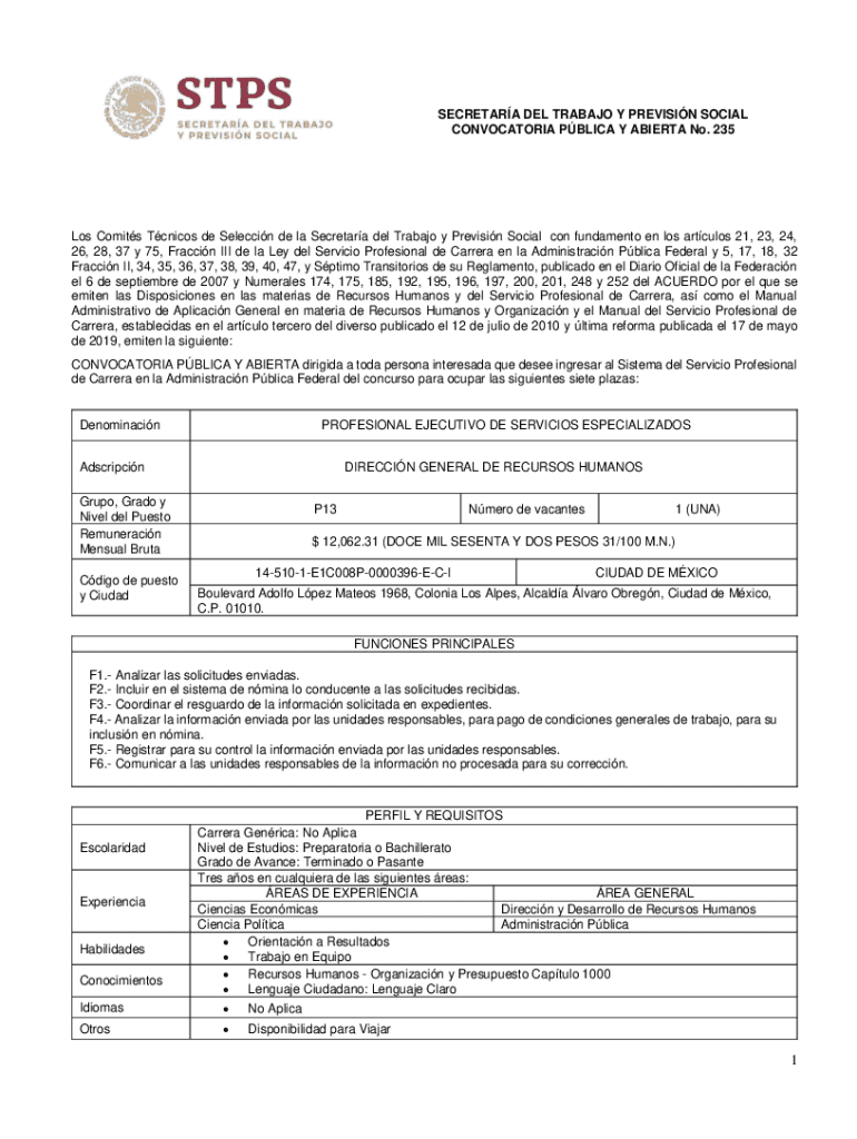 CONVOCATORIA PBL ICA Y ALBERTA No. 235Los Comics Tunics de Seleccin de la Secretary Del Tribal y Prevision Social con fundament en Los articles 21, 23, 24,