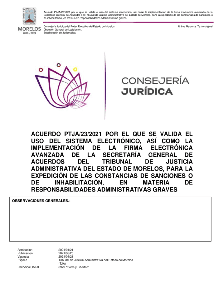 Acted PTA/23/2021 POR el Que SE valid el USO Del system electric, as Como la implementation DE la firm electronica Canada de la Secretary General de Acuerdos Del Tribunal de Justicia Administrative