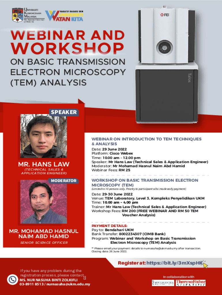 The National University of MalaysiaWEBINAR ANDWORKSHOPON BASIC TRANSMISSION ELECTRON MICROSCOPY (TEM) ANALYSIS SPEAKERWEBINAR ON INTRODUCTION TO TEM TECHNIQUES & ANALYSIS MR. HANS LAW (TECHNICAL SALES
