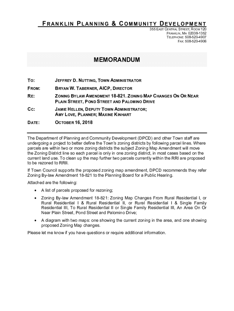 FRANKLIN PLANNING & COMMUNITY DEVELOPMENT 355 EAST CENTRAL STREET, ROOM 120 FRANKLIN, MA 020381352 TELEPHONE: 5085204907 FAX: 5085204906MEMORANDUM TO:JEFFREY D. NUTTING, TOWN ADMINISTRATORFROM:BRYAN