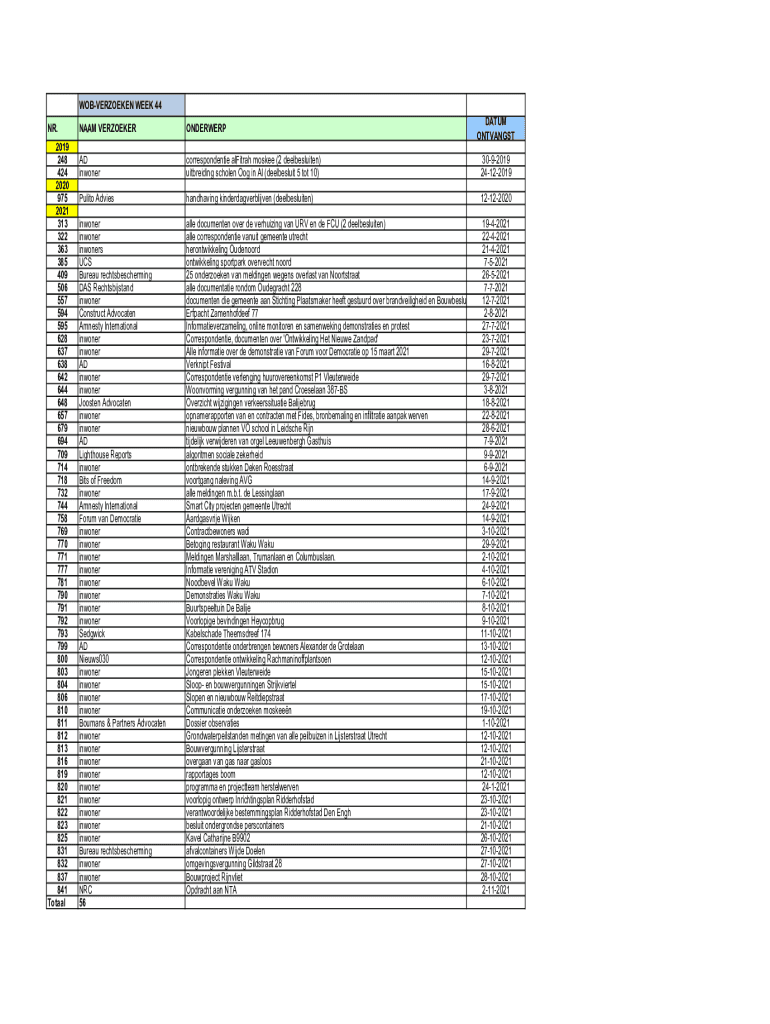 WOBVERZOEKEN WEEK 44 NR. 2019 248 424 2020 975 2021 313 322 363 385 409 506 557 594 595 628 637 638 642 644 648 657 679 694 709 714 718 732 744 758 769 770 771 777 781 790 791 792 793 799 800 803