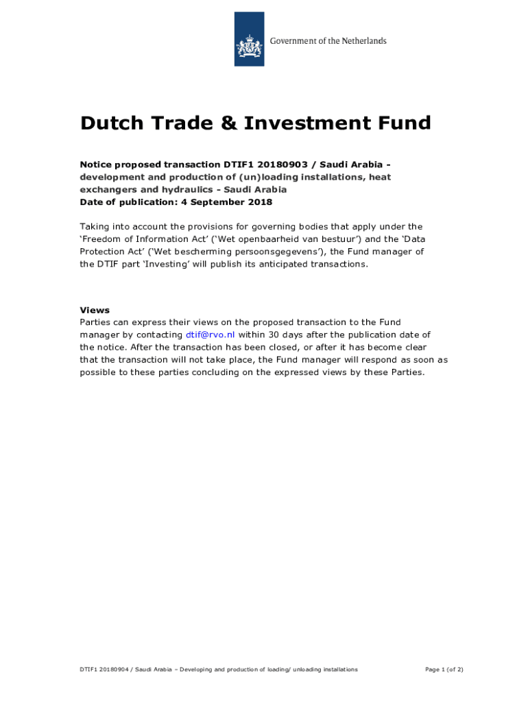 Dutch Trade & Investment Fund Notice proposed transaction DTIF1 20180903 / Saudi Arabia development and production of (UN)loading installations, heat exchangers and hydraulics Saudi Arabia Date of